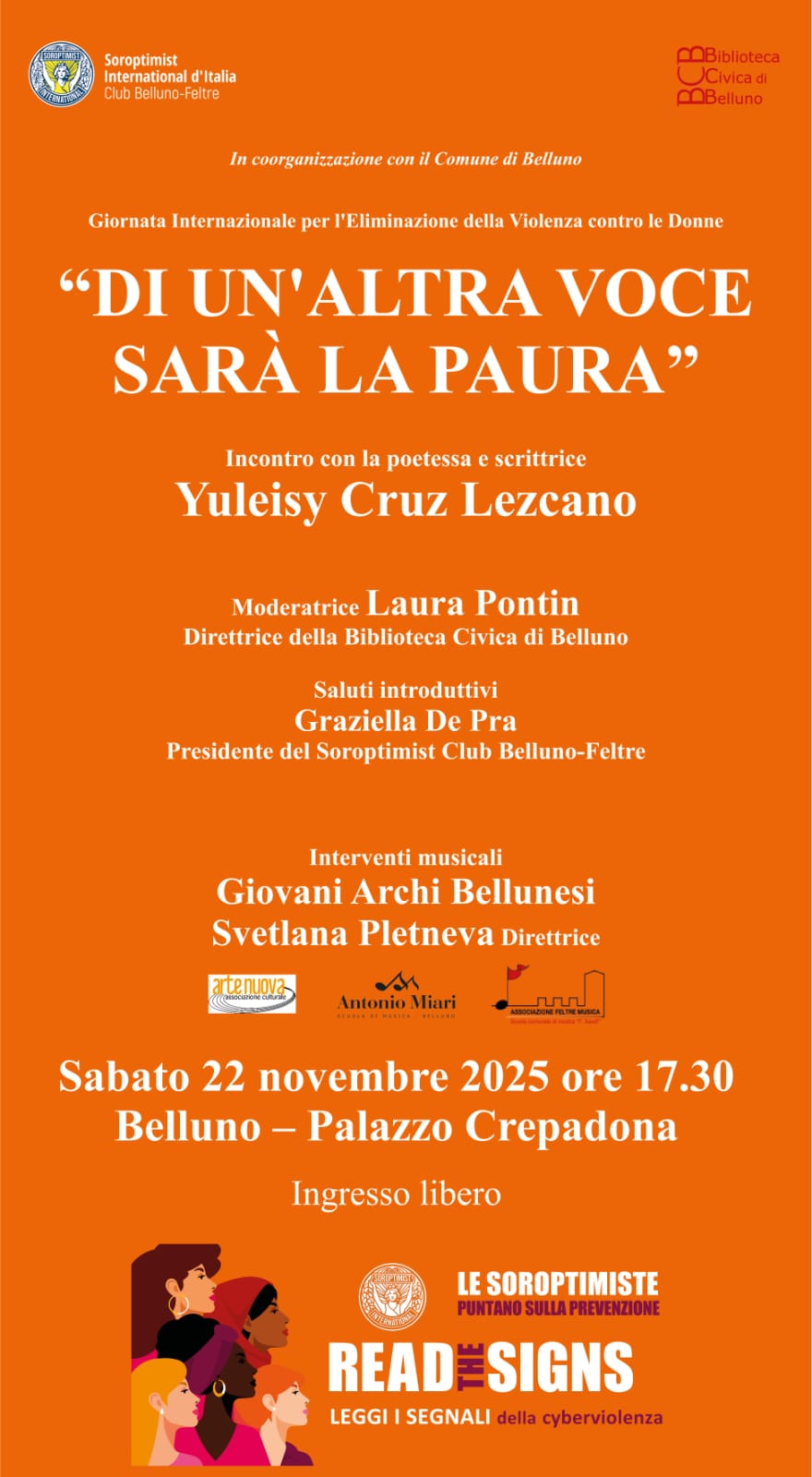 In occasione della Giornata internazionale per l'eliminazione della violenza contro le donne, sabato 22 novembre 2025, dalle 17.30 alle 19.30, la Corte interna di Palazzo Crepadona ospiterà l'incontro/conferenza per presentare il libro "Di un'altra voce sarà la paura – Poesia, denuncia e rinascita". L'appuntamento, organizzato dal Soroptimist Club Belluno Feltre in collaborazione con il Comune di Belluno, la Biblioteca Civica e il Gruppo Giovani Archi Bellunesi, sarà aperto dai saluti di Graziella De Pra, presidente del Soroptimist Club Belluno Feltre.