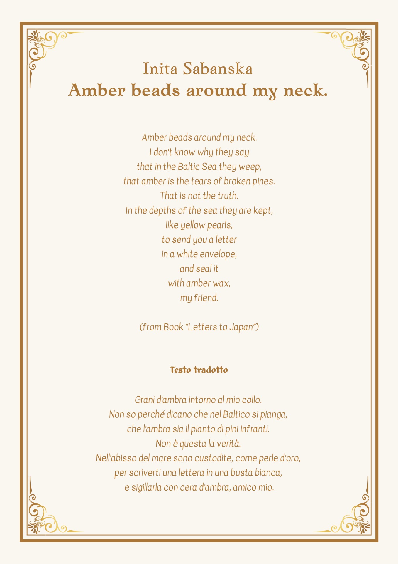 Nella prima poesia che ho inviato al concorso, ho usato figurativamente l'ambra, caratteristica della Lettonia e del Mar Baltico, vicino al quale ci troviamo, perché queste metafore descrivono bene il nostro paese e la nostra gente. Ognuna delle poesie inviate ha una sua filosofia. Per me è importante pensare alla mia anima, alla vita e cercare un significato più profondo. Le nostre anime trovano realizzazione in se stesse se cercano qualcosa di più di ciò che è materiale.»