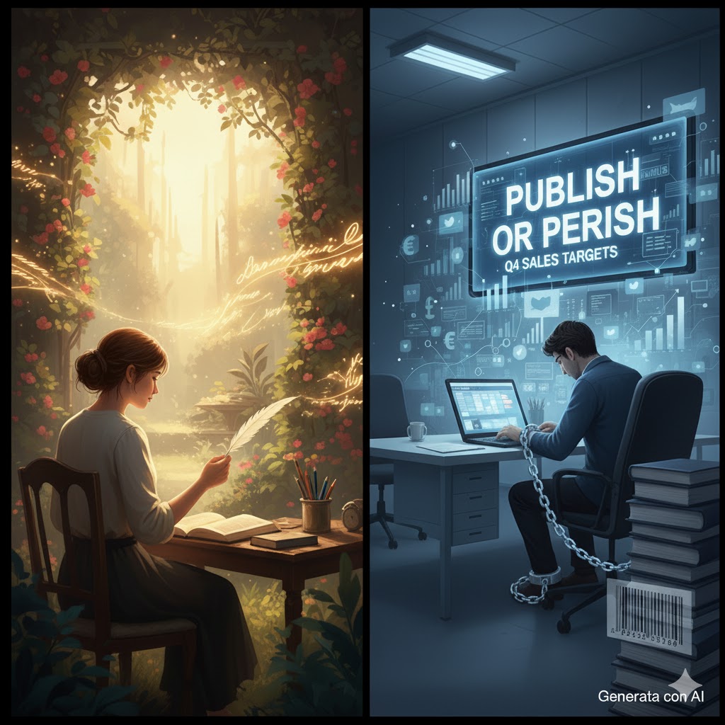 Se un pianista suona per passione, la sua musica è apprezzata per quello che è: suono, ritmo, emozione. Nessuno pretende che debba esibirsi alla Scala per riconoscergli talento, se un pittore espone i suoi quadri su una bancarella, la sua arte è fruibile in modo diretto, uno a uno: o piace o non piace. L'opera è lì, tangibile, visibile, priva di filtri. La scrittura, invece, non esiste se non passa attraverso una macchina complessa e impersonale: quella dell'editoria. Uno scrittore può avere un talento immenso, ma se non pubblica, non esiste. La sua opera, per esistere davvero nel mondo, deve diventare un libro, un oggetto fisico (o digitale) che circola, che viene venduto, recensito, promosso, premiato, impacchettato, e, addirittura, replicato in centinaia, migliaia, milioni di copie identiche.