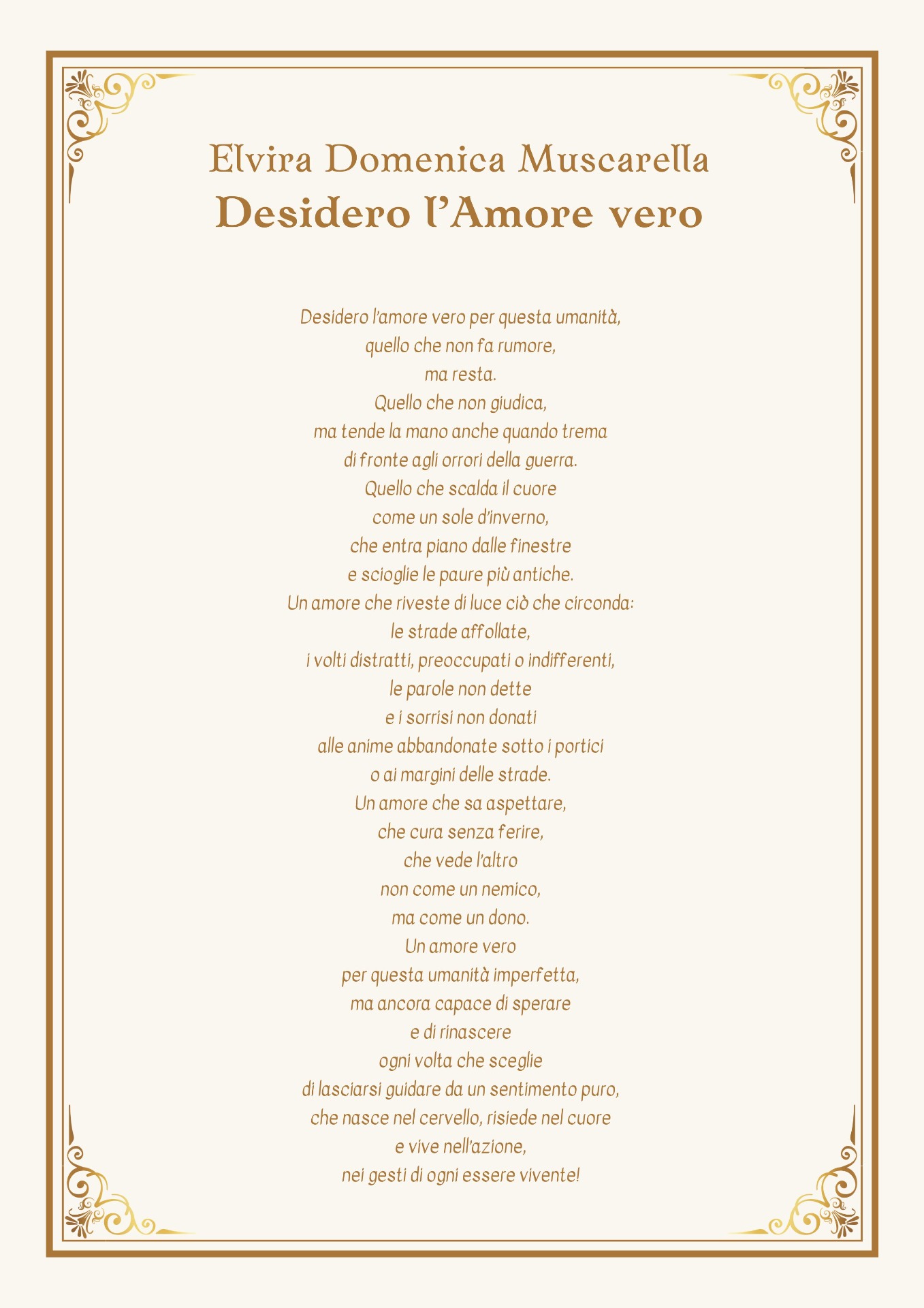 « Per me la poesia nasce come un bisogno dell'anima, ma non resta chiusa lì. In "Desidero l'amore vero" l'amore è qualcosa che va vissuto e scelto ogni giorno. In un tempo segnato da conflitti e indifferenza, la poesia è prima di tutto una forma di umanità, ma proprio perché parla al cuore può diventare anche una forma di resistenza silenziosa, che si trasforma in attenzione e cura verso gli altri. »