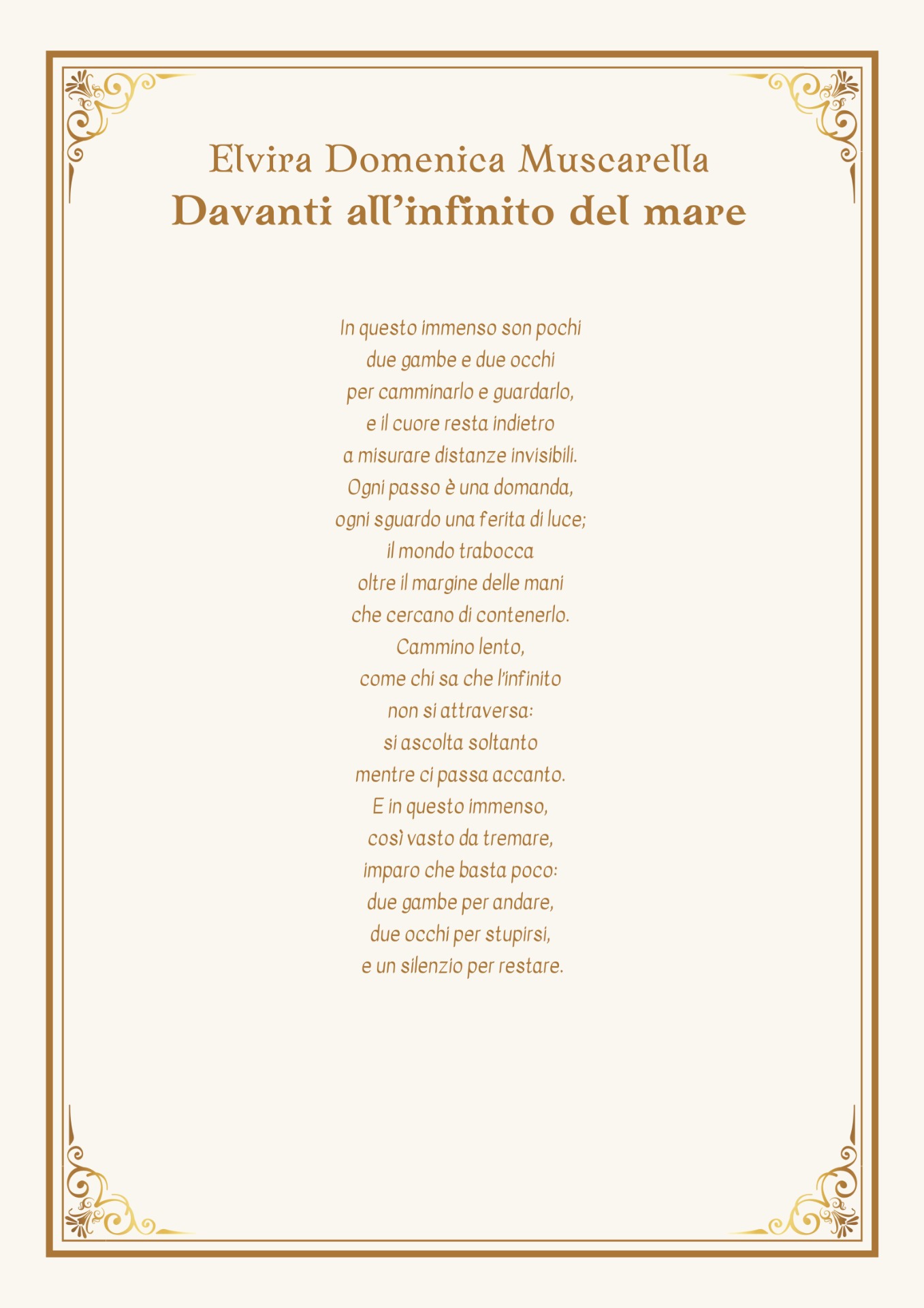 « La bellezza dell'infinito ci ferisce perché ci supera. Davanti al mare, al cielo, al cosmo, sentiamo tutta la nostra fragilità e allo stesso tempo un richiamo potente. È una ferita di luce perché non fa male per distruggere, ma per aprire: ci ricorda che siamo umani, ma anche capaci di desiderare l'eterno. In questo contrasto nasce lo stupore, ed è lì che nasce una verità profonda sull'essere umano. »