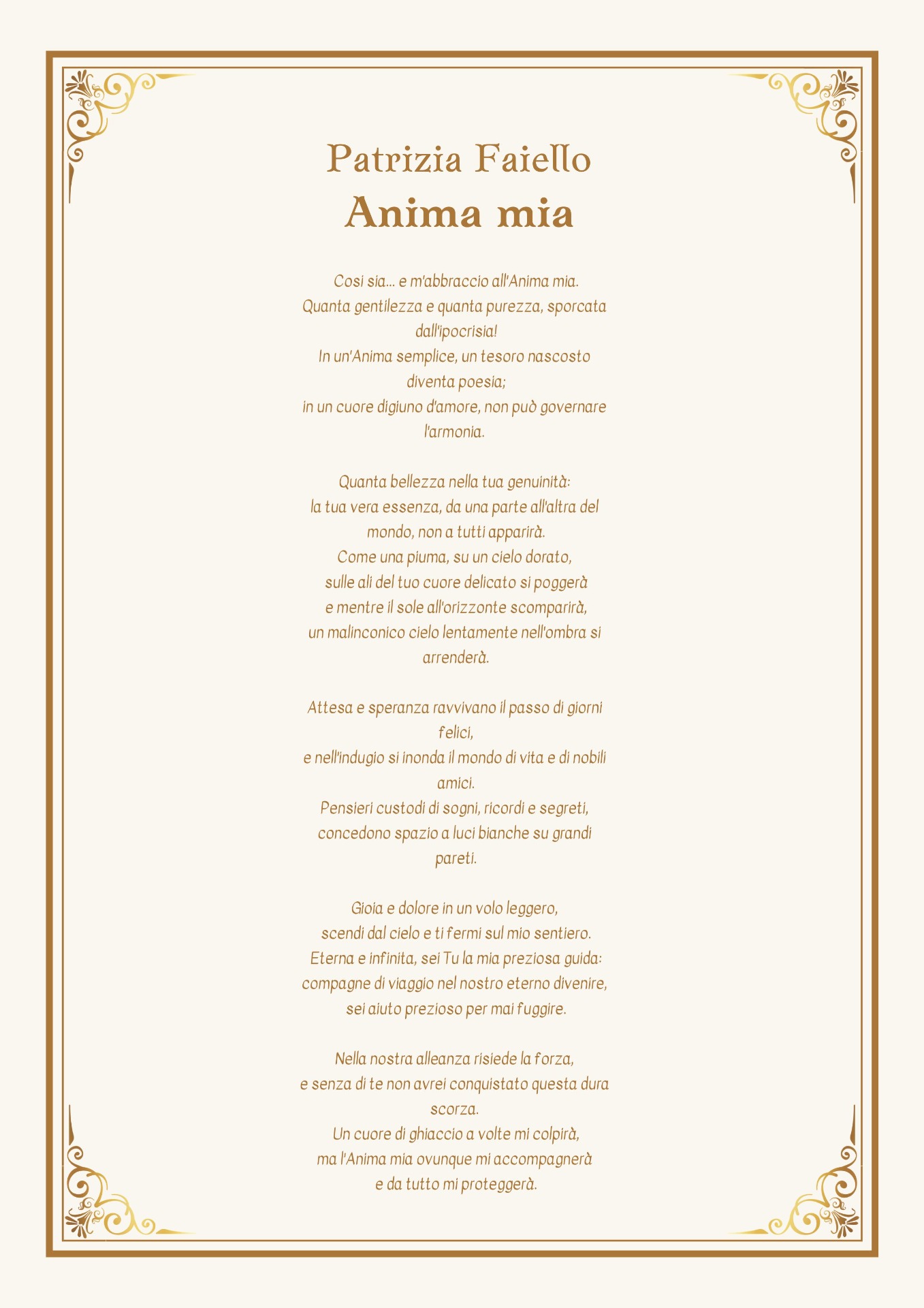 «La mia scrittura nasce da ciò che vedo e respiro ogni giorno; è quel bisogno, direi incontrollabile, di fermare un istante che mi ha colpita. Se uso immagini come la piuma o il cielo dorato è perché ho imparato a cercare il bello anche nelle piccole cose, per non lasciarmi travolgere dalla frenesia. Per me la natura e la musica non sono sfondi, ma compagne di viaggio: spesso scrivo proprio mentre ascolto un brano che mi emoziona o mentre osservo un tramonto che mi toglie il fiato. In quei momenti, le parole arrivano da sole, seguendo il ritmo di quello che sto provando. Non invento nulla, cerco solo di tradurre in poesia la vita vera, con tutta la sua dolcezza e la sua malinconia.»