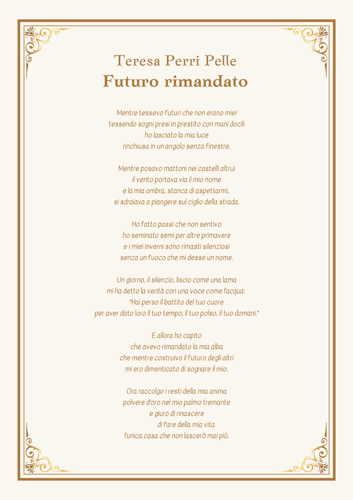 2. Le tue opere "Futuro Rimandato" e "Ho Dimenticato Me" sono percorsi di dolore e di incredibile forza. In esse descrivi il tempo passato a costruire "castelli altrui" mentre il vento portava via il tuo nome. In "Futuro Rimandato" c'è un verso che colpisce profondamente: "Hai perso il battito del tuo cuore per aver dato loro il tuo tempo". Sembra quasi una confessione che accomuna molte donne e artiste. La tua poesia vuole essere un monito per chi legge, un invito a non "rimandare la propria alba" per assecondare le aspettative altrui?