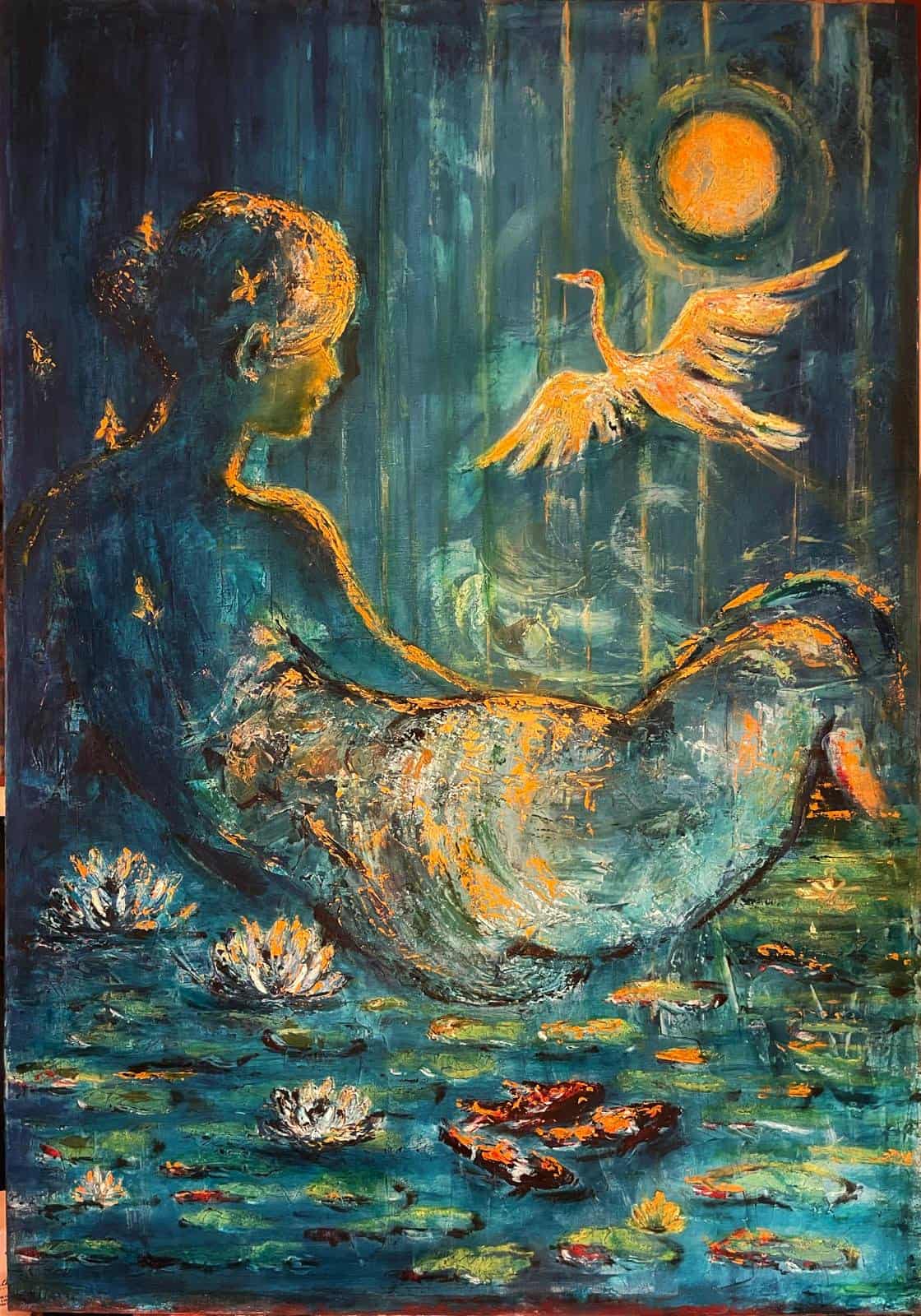 Immersing the observer in a scenario suspended between night and day, the painting titled "Memoria liquida" (Liquid Memory), the first in a series dedicated to the relationship between woman and nature, is dominated by a palette of deep blues and petrol greens that suggest a sensation of quiet, mystery, and oblivion. All this is further heightened by the delicate play of contrasts between the cold half-light and the orange glow that models the female figure. The latter, in deep integration with the background—almost an indivisible whole with the aquatic element punctuated by water lilies—is delineated by warm and luminous tones, radiating through the composition.